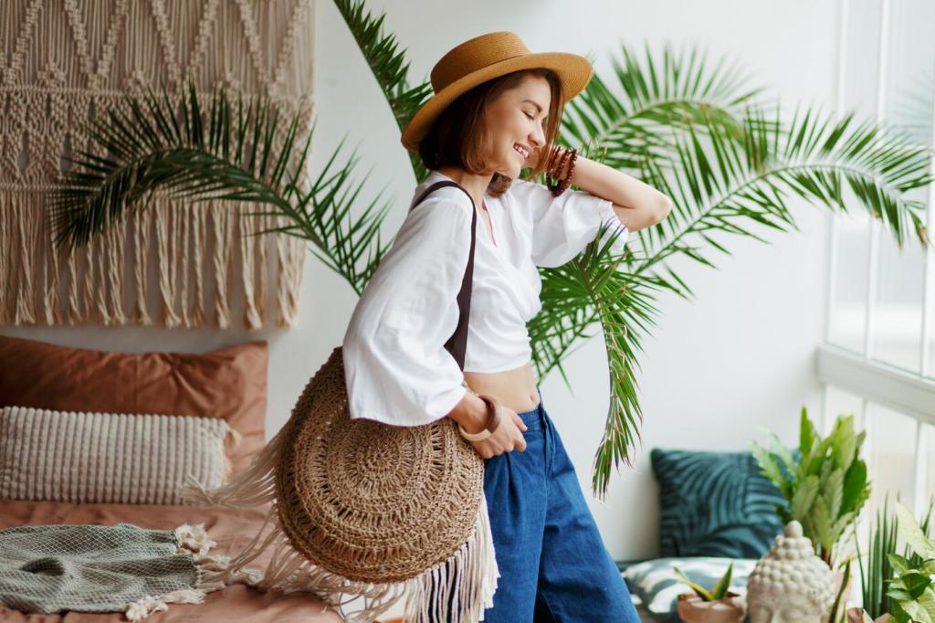 Patchwork-Teppiche aus Vintage-Teilen, Messing mit Patina, bunte Fliesen aus recycelter Keramik. Unterschiedliche Epochen treffen sich und wirken durch wiederkehrende Materialien verbunden. Pflanzen und handgefertigte Körbe aus Recyclingfasern runden das Bild harmonisch ab.
